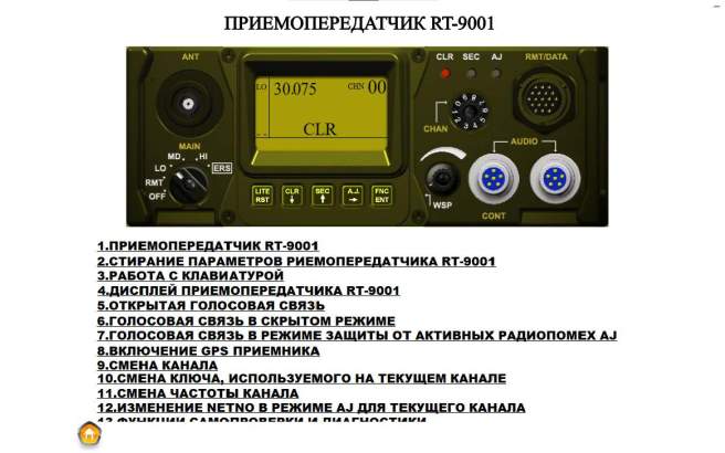 Программное обеспечения для обучения персонала навыкам работы с приемопередатчиком RT-9001. Полностью имитирует работу всех режимов оборудования. Может быть использовано в учебных центрах заказчика