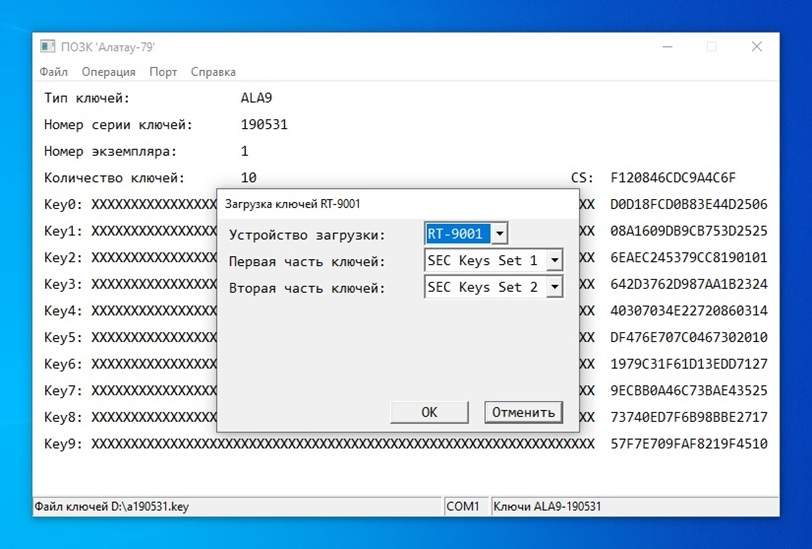 Программное обеспечение загрузки ключей "Алатау-79" предназначено для загрузки ключей в радиостанции CNR‑9000 (приемопередатчик RT‑9001), радиостанции CNR‑710 (приемопередатчики RT‑710G и RT-710MBN) и другие средства криптографической защиты информации, совместимые с ними по ключевой системе.